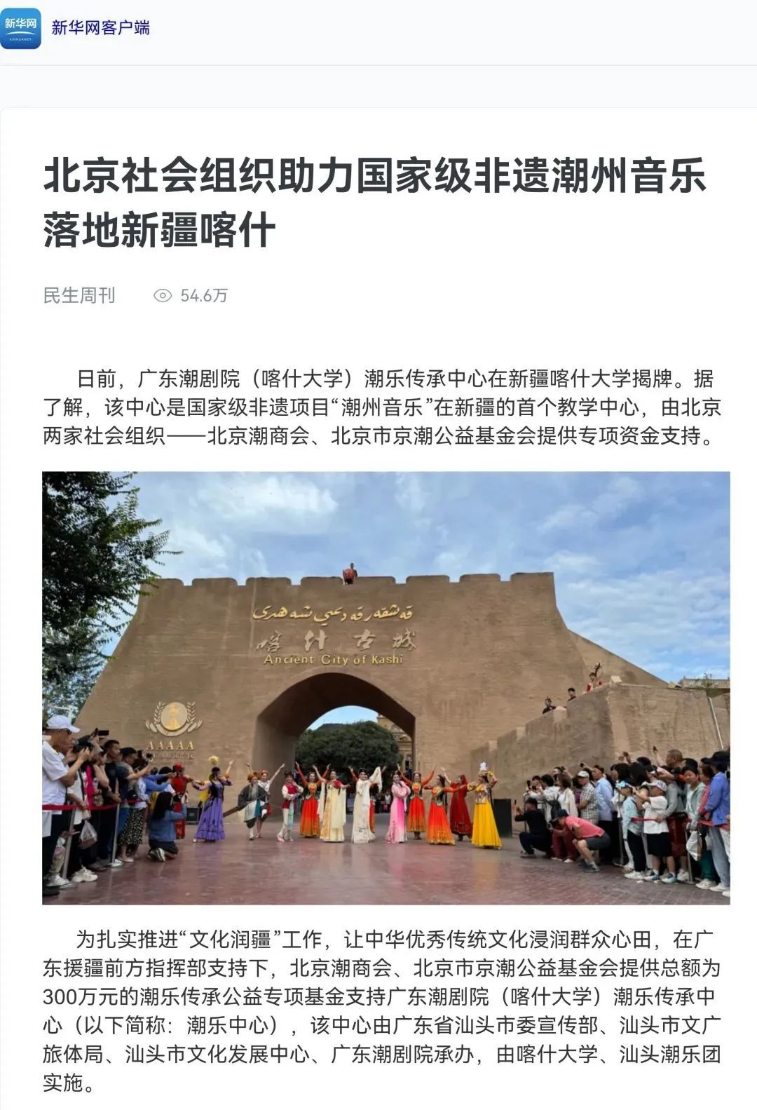 文化的力量是无穷的,它能够跨越地域,连接心灵,促进民族团结。北京市京潮公益基金会、北京潮商会参加了喀什古城下举办的文化快闪活动,更是与喀什市民乃至中亚友人共同感受到了潮汕文化和新疆艺术相交流的独特魅力,拉近了两地人民的心灵距离。