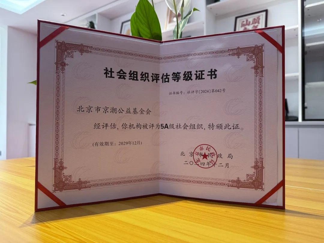 北京市京潮公益基金会经专业评估机构评估和北京市社会组织评估审核委员会审议,在北京市民政局组织的北京市社会组织等级评估中获评为5A级社会组织,并荣获北京市民政局颁发的北京市社会组织评估等级证书和牌匾。这标志着北京市京潮公益基金会将进入更加标准化和专业化的新发展模式。