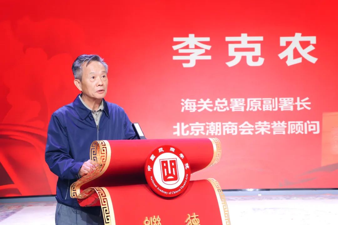 李必友在仪式上致辞时表示,四年来,国戏高度重视潮剧本科班,完善培养方案,改进办学模式,创新实践机制,通过聘请著名表演艺术家姚璇秋先生为荣誉教授来校亲授,搭建校内外实践和国际文化交流的高端展示平台,跨系部组织专家集中力量创排毕业大戏,诚请京昆名家收徒3名潮剧学子等等创新举措,努力把这届潮剧班办的有特色、高质量。我们为潮剧班学生在校学习成长取得的可喜成绩感到欣慰;为“南国鲜花”首次亮相中央电视台春晚,展示学校人才培养成果感到骄傲。我们深感,高层次潮剧艺术人才的培养,得益于“学校、地方、院团、社会”多方力量的汇聚与协同。正是有了汕头市委市政府的高位推动,实现了战略合作协议的落地见效;正是有了汕头教学实践基地的协同育人,提升了潮剧人才培养的质效;正是有了北京潮商会、京潮公益基金会的扶持资助,助力了潮剧艺术事业的传承发展。