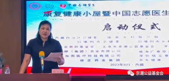 北京市京潮公益基金会理事长单虹在启动仪式上发表致辞。单虹理事长表示,根据习近平总书记关于 “让贫困和偏远地区人民得到及时、有效医治”的指示,此次,由阳柳集团出资250万元,通过北京市京潮公益基金会与北京凌锋公益基金会进行合作,在西藏自治区日喀则市建设康复健康小屋,为的就是把我们的公益慈善事业做到最需要的地方去,给最需要的人们送去我们的温暖。我们深信,随着康复健康小屋建成,将直接为村一级卫生服务中心和卫生室增设以康复为主要目的医疗健康场所,为乡村群众提供健康意识、健康知识,提高生活质量,促进乡村健康发展。她希望双方通过合作,能够更好地助力西藏医疗公益事业的蓬勃发展。
