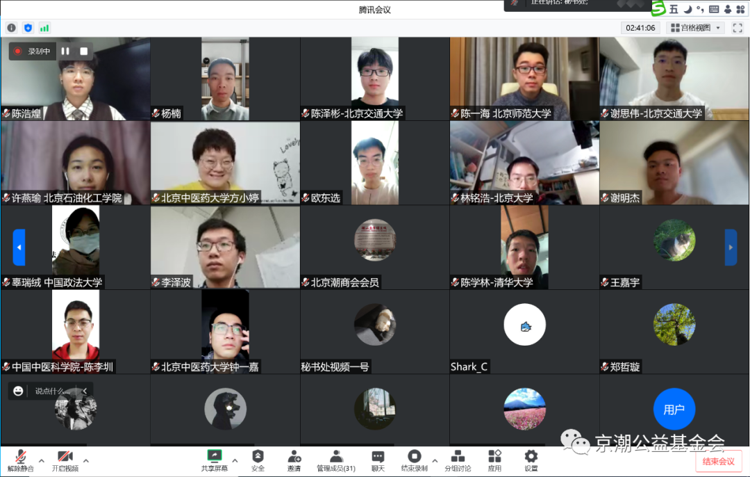 中国戏曲学院潮剧本科班班长戴淑刁,学员陈伟强、蔡锦浩;北京师范大学陈一海、中国政法大学谢明杰、北京师范大学陈思涵、北京大学陈浩煌、北京中医药大学方小婷、北京交通大学陈泽彬等同学对北京市京潮公益基金会和北京潮商会召开首次线上恳谈会表示衷心的感谢,分别就来京后的学习和生活情况,以及基金会和商会对自身带来的影响等方面发表精彩感言,畅谈了个人心声,充满青春力量,彰显了新时代青年人拼搏精神和逐梦勇气,激励着更多优秀学子砥砺前行。