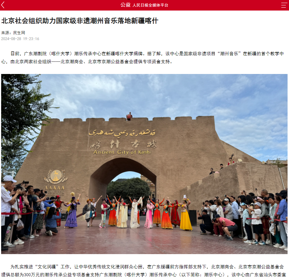 在党的二十届三中全会精神指引下,北京市京潮公益基金会、北京潮商会积极响应国家战略,以国家级非遗潮乐走进新疆为抓手,携手推进“文化润疆”工程。通过推动潮乐与新疆艺术的高度融合,让中华优秀传统文化在新疆喀什地区生根发芽,浸润群众心田,为新疆地区的文化发展、商贸促进和民族团结作出积极贡献。