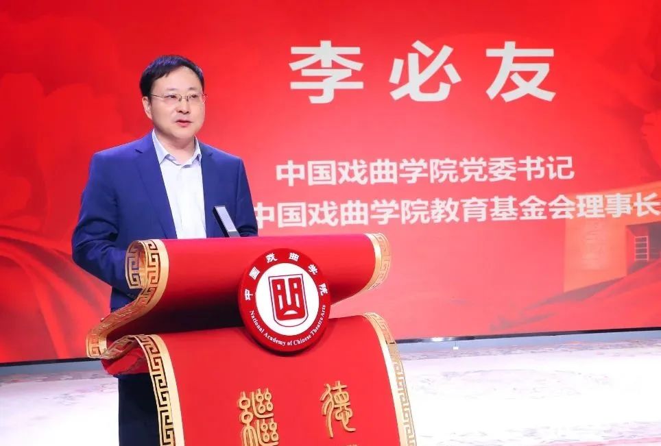 李必友在仪式上致辞时表示,四年来,国戏高度重视潮剧本科班,完善培养方案,改进办学模式,创新实践机制,通过聘请著名表演艺术家姚璇秋先生为荣誉教授来校亲授,搭建校内外实践和国际文化交流的高端展示平台,跨系部组织专家集中力量创排毕业大戏,诚请京昆名家收徒3名潮剧学子等等创新举措,努力把这届潮剧班办的有特色、高质量。我们为潮剧班学生在校学习成长取得的可喜成绩感到欣慰;为“南国鲜花”首次亮相中央电视台春晚,展示学校人才培养成果感到骄傲。我们深感,高层次潮剧艺术人才的培养,得益于“学校、地方、院团、社会”多方力量的汇聚与协同。正是有了汕头市委市政府的高位推动,实现了战略合作协议的落地见效;正是有了汕头教学实践基地的协同育人,提升了潮剧人才培养的质效;正是有了北京潮商会、京潮公益基金会的扶持资助,助力了潮剧艺术事业的传承发展。